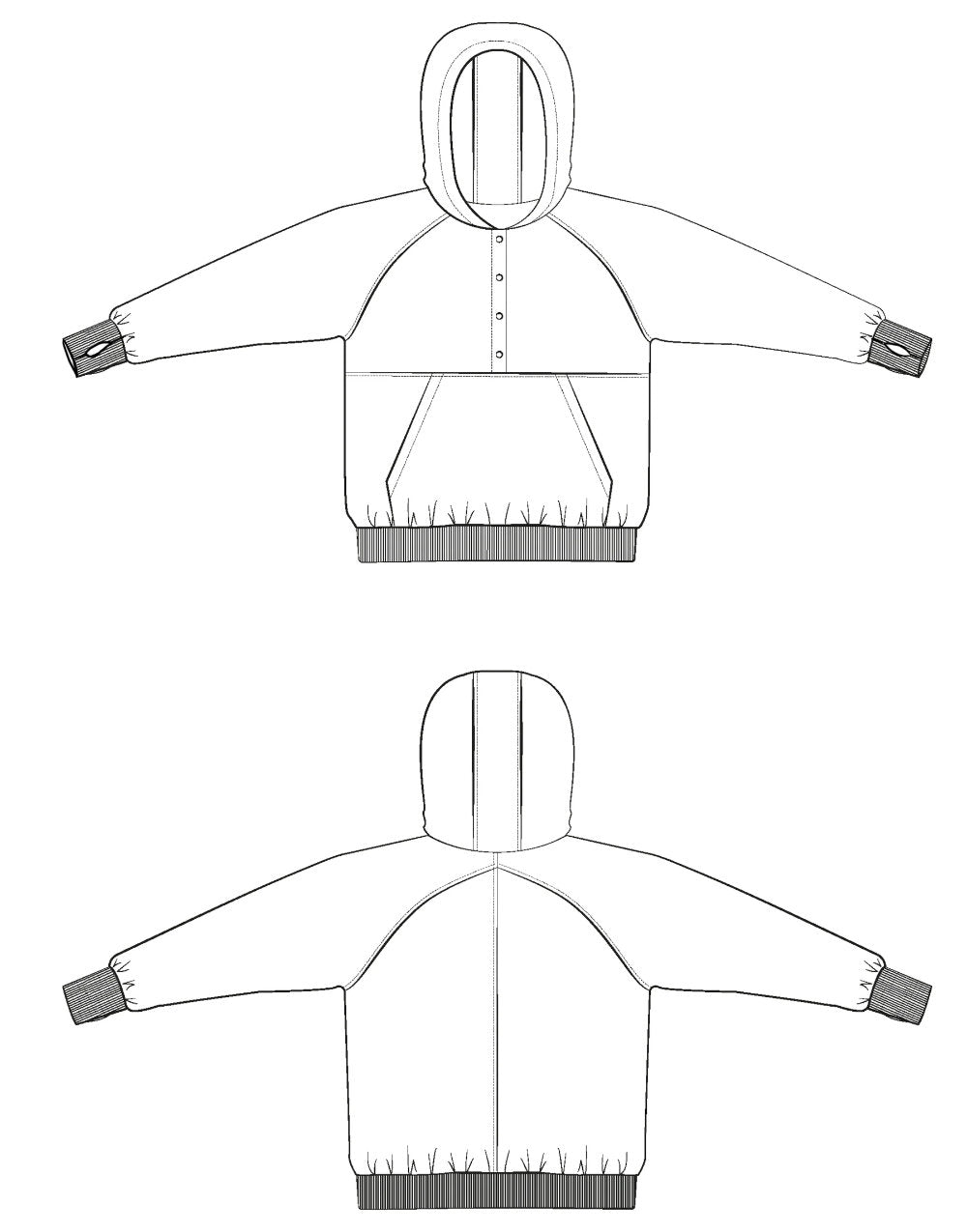 Fabric Suggestions: Sweatshirt fabrics such as jersey, French terry, sweater knit, as well as ribbed cuffs.