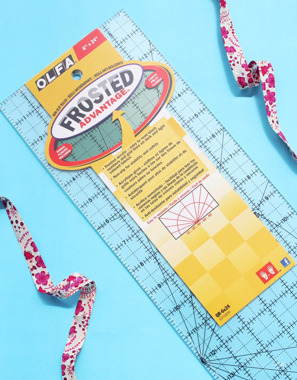 Frosted acrylic with black numbers and lines for clarity on light and dark coloured fabrics. Grid lines are spaced at the inch with increments of 1/8, 1/4 and 1/2 inches.