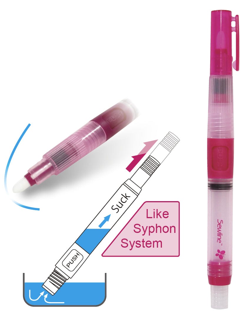 Fill the reservoir with water then squeeze the sides to release a gentle amount of water through the fibre-tip point. Gentle enough for all fabrics yet effective enough to remove all water soluble marks.