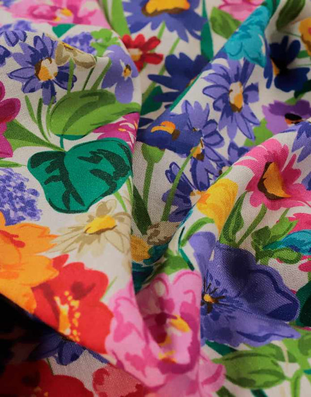 Cascading flowers with a modern Scandi vibe printed onto the most wonderful quality viscose linen dressmaking fabric. An abundance of colour is displayed in this floral design, just perfect for a voluminous dress or blouse. A fantastic super soft lightweight viscose linen dressmaking fabric with plenty of drape.