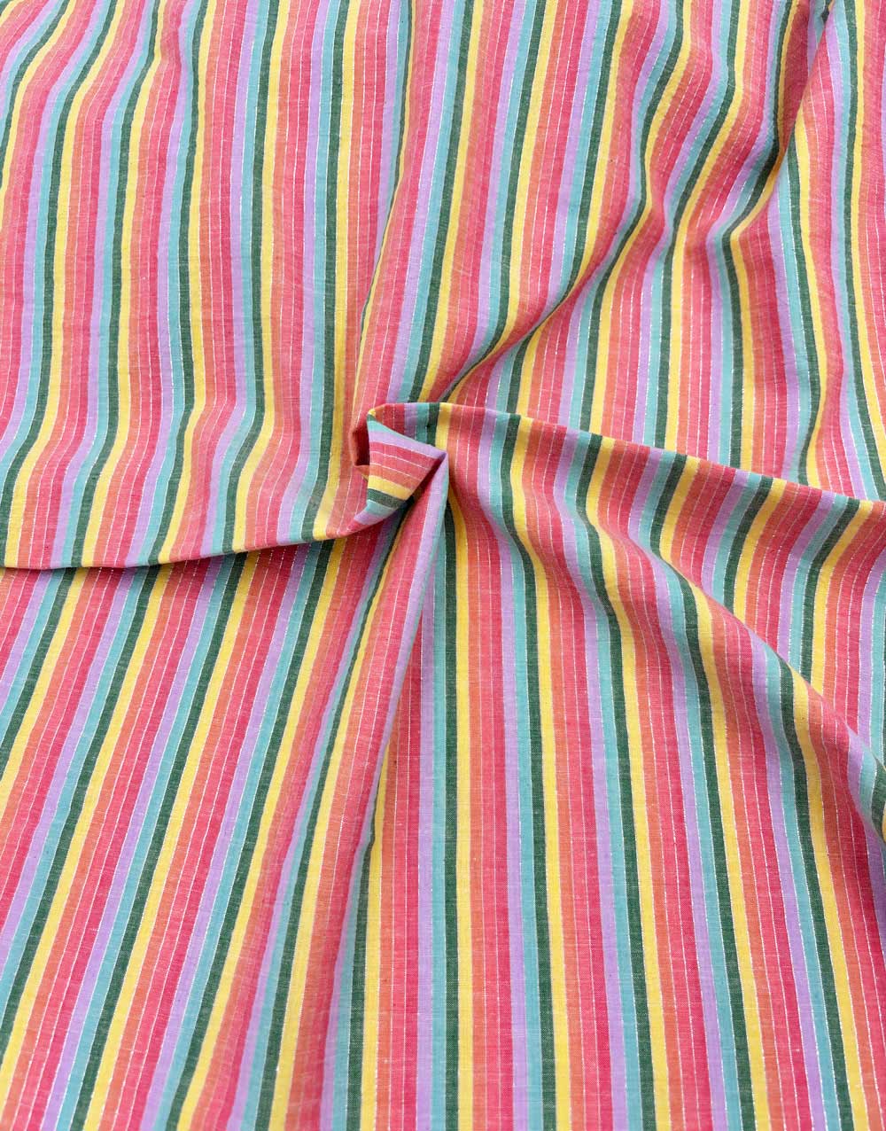 A joyful celebration of colour and shimmer, this pastel and metallic stripe Indian woven cotton brings sunshine to any sewing project. Featuring stripes in peach, lilac, mint, sunshine yellow and rose interspersed with fine metallic threads, it catches the light beautifully without being overpowering.