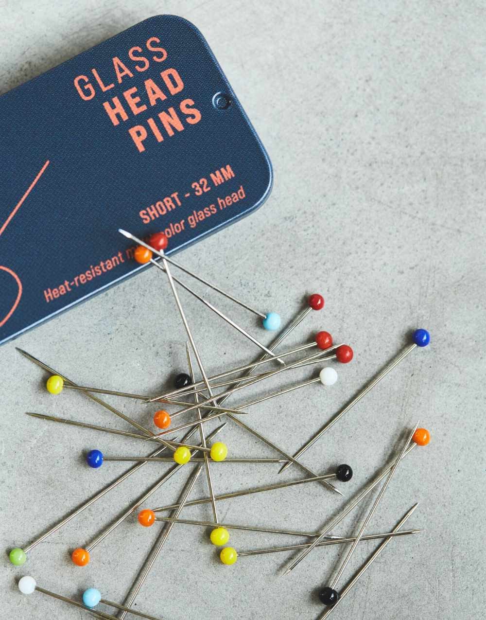 Shorter than 'normal' stainless steel pins with heat-resistant coloured glass heads, packaged in a stylish tin with a sliding lid.