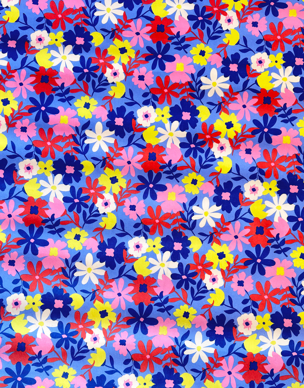 A coated cotton fabric featuring a vibrant, cheerful floral design bursting with bold, oversized flowers in shades of red, pink, yellow, white, and navy on a bright blue background. Read more