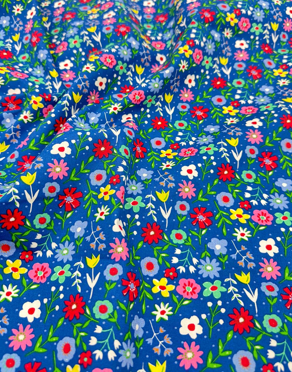 A cheerful scattering of stylised blooms in red, pink, lilac, lemon and white pop against a rich blueberry blue backdrop in this delightful cotton poplin. It’s the kind of print that lifts the spirits - playful, nostalgic and full of colour.