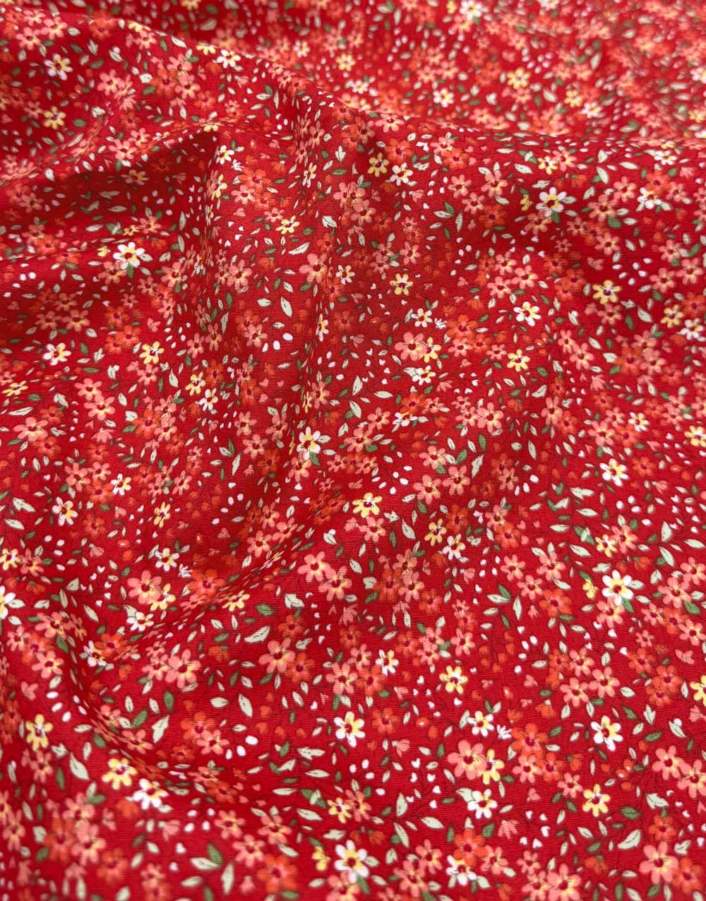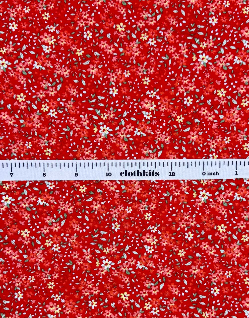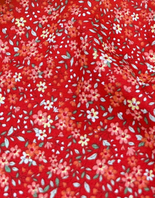 Packed with charm and cheerful colour, Cherry Drop Ditsy is a tiny floral wonder bursting with personality. Set against a vibrant cherry red background, the scattered coral, blush and white blossoms are lifted with sprigs of soft green foliage - an irresistible print with vintage flair and year-round appeal.