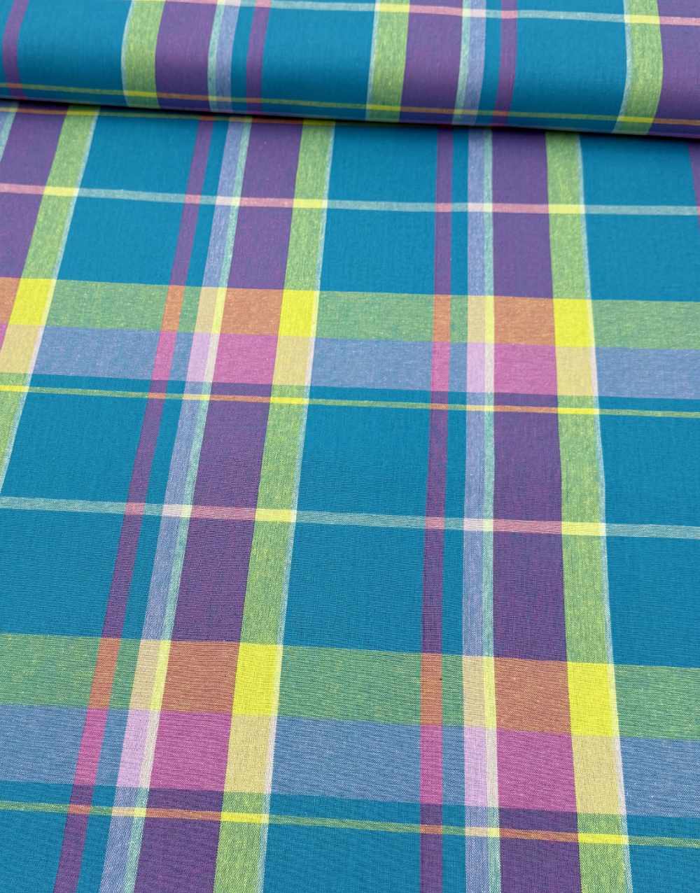 Dive into colour with Electric Lagoon! A vibrant woven Madras cotton bursting with turquoise, lime, orchid and bubblegum pink. Bold yet breezy, this fabric brings instant joy to any project, from summery shirts and swishy skirts to standout accessories.