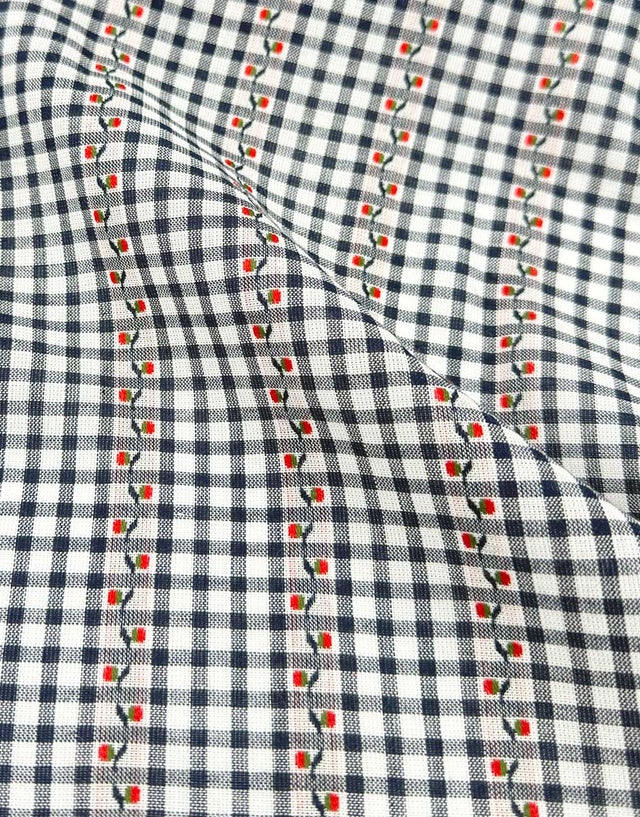 This beautifully soft cotton gingham is given a delicate twist with embroidered blossom stripes, woven into the fabric in a subtle jacquard effect. The navy and white check has a gentle drape, making it perfect for light, summery garments with a touch of charm. Ideal for soft pyjama bottoms, breezy blouses, children’s wear, or relaxed dresses, it combines comfort with a playful vintage feel.