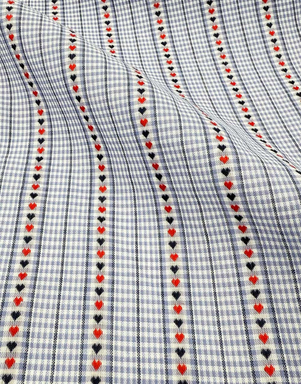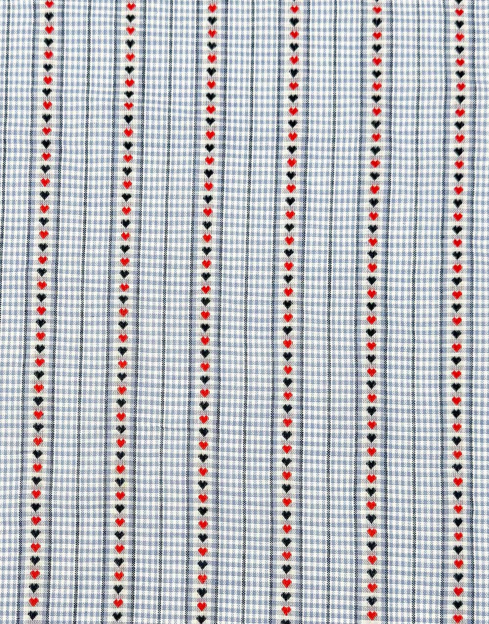 This light blue gingham cotton is softened with embroidered jacquard stripes, each decorated with rows of tiny red and navy hearts. Lightweight and airy, it feels gentle against the skin and has a soft drape Read more