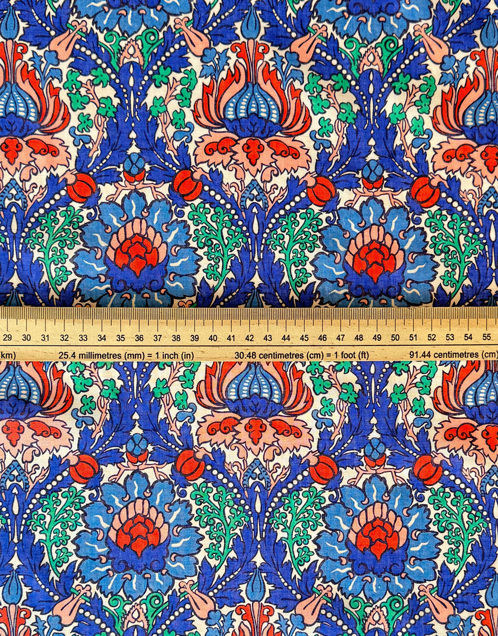 Drawing inspiration from Liberty’s rock star clientele of the 1960s and 1970s, this flamboyant ornamental incorporates a series of influences, including a mirrored Arts & Crafts layout, traditional damask floral motifs, and even a touch of colourful psychedelia.