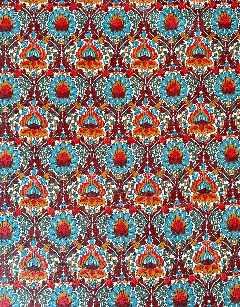 Drawing inspiration from Liberty’s rock star clientele of the 1960s and 1970s, this flamboyant ornamental incorporates a series of influences, including a mirrored Arts & Crafts layout, traditional damask floral motifs, and even a touch of colourful psychedelia.