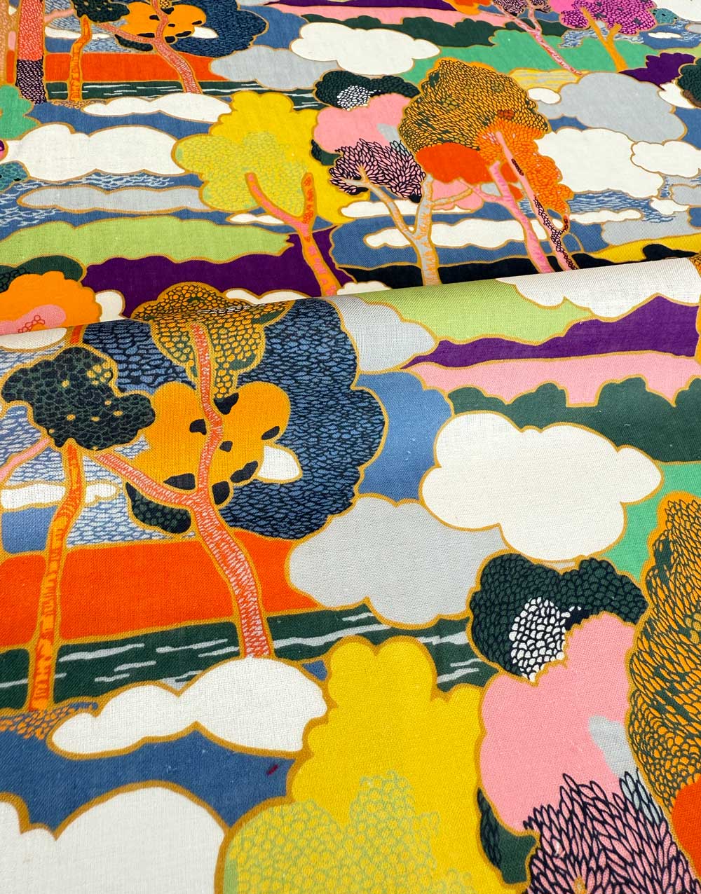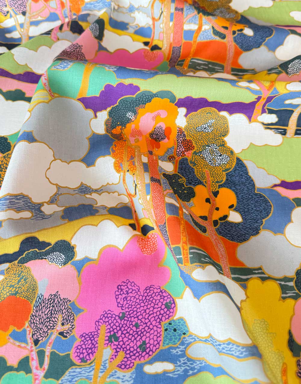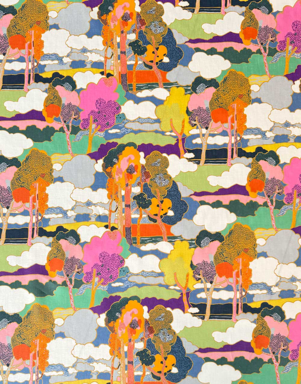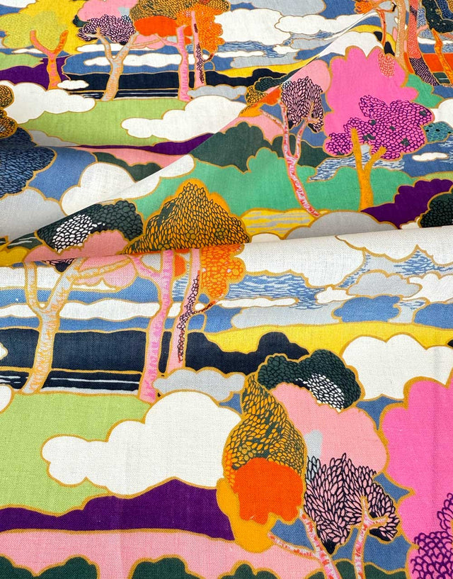 Prospect Road is an archival classic, based on a Liberty design from 1968. A revival of traditional Art Nouveau landscape prints, it features subtly arranged clusters of trees in a dreamy, jewel-toned setting.