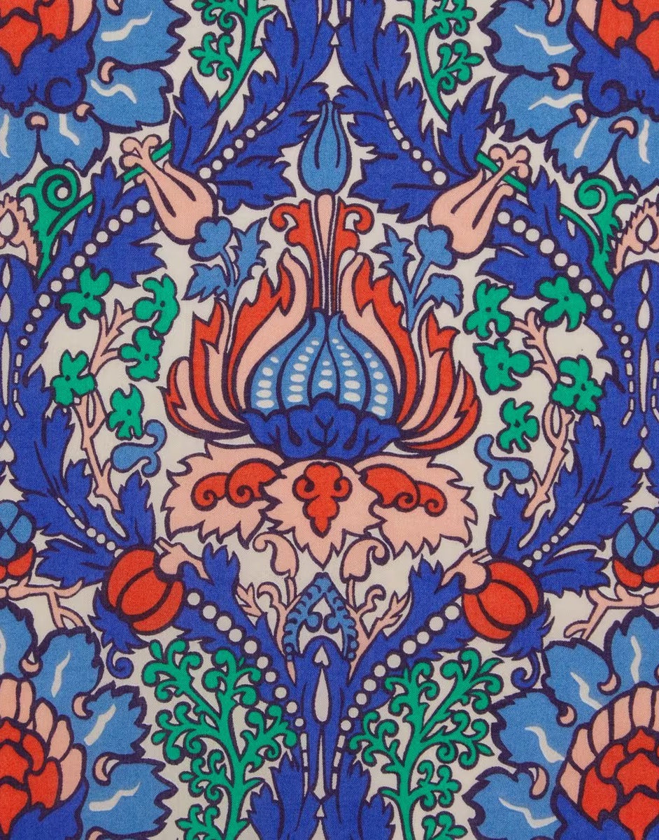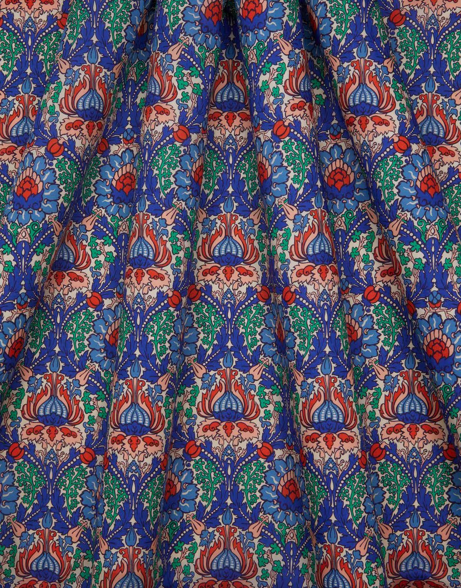 Drawing inspiration from Liberty’s rock star clientele of the 1960s and 1970s, this flamboyant ornamental incorporates a series of influences, including a mirrored Arts & Crafts layout, traditional damask floral motifs, and even a touch of colourful psychedelia.