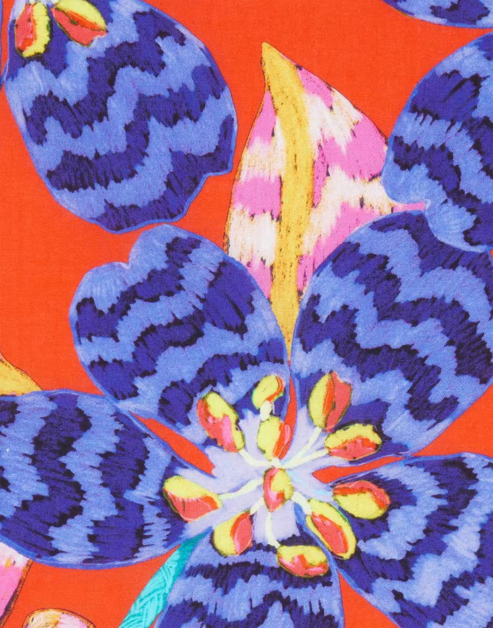 Hand-painted in crayon, Leading Lady features dramatic blooms in a riotous carousel of contrasting colour, pattern, texture and movement.