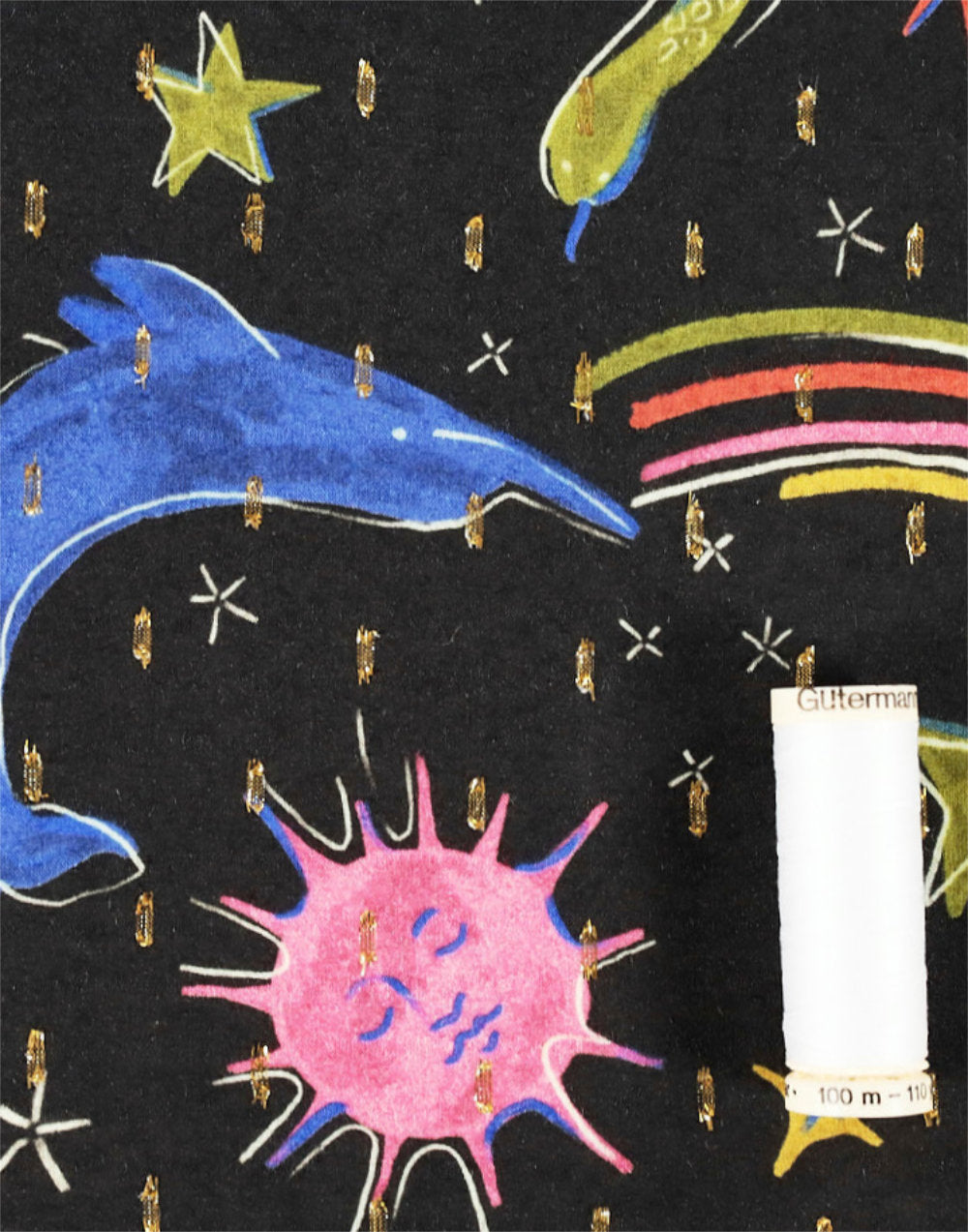 This viscose dressmaking fabric has a magical feel, featuring vibrant pink dolphins, leopards and snakes set against a celestial backdrop; it is printed onto super-soft viscose lawn and accented with gold metallic dobby spots for a touch of added sparkle. Ideal for lightweight blouses and dresses.