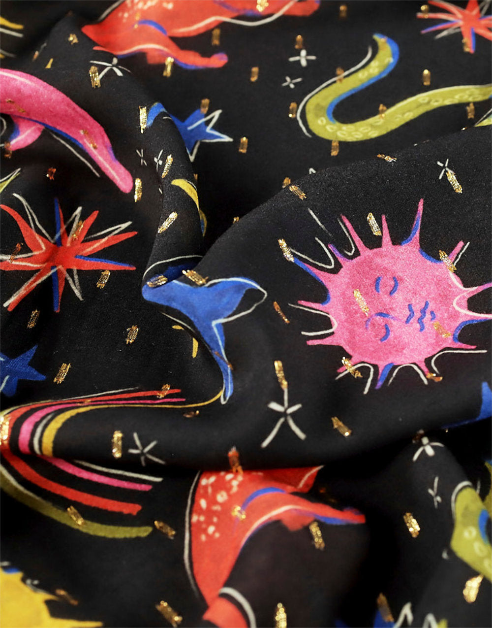 Featuring vibrant pink dolphins, leopards and snakes set against a celestial backdrop, printed onto super-soft viscose lawn and accented with gold metallic dobby spots for a touch of added sparkle. Read more