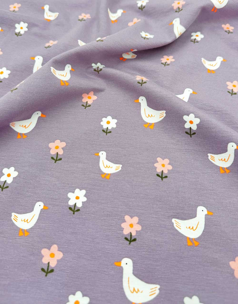 This cotton jersey fabric features an adorable pattern of ducks and flowers on a soft lilac background, accented with playful pops of orange and pastel tones. Read more