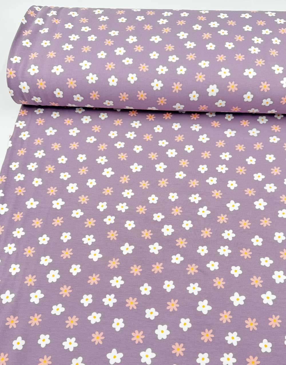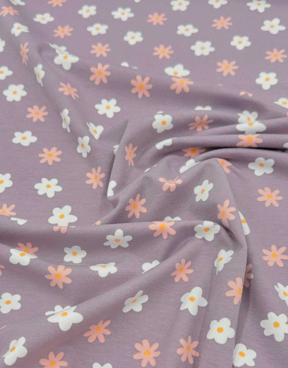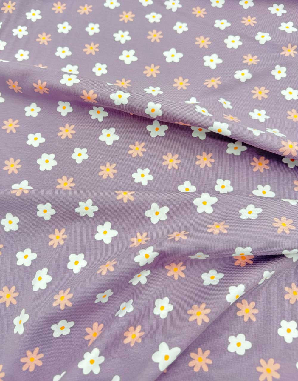 This cotton jersey fabric features a unique scattered floral design with pops of bright orange on a muted lavender background. The bold contrast between the soft base and vibrant accents creates a fresh, modern look with a retro twist. With a soft stretch and smooth finish, this fabric offers both comfort and style.
