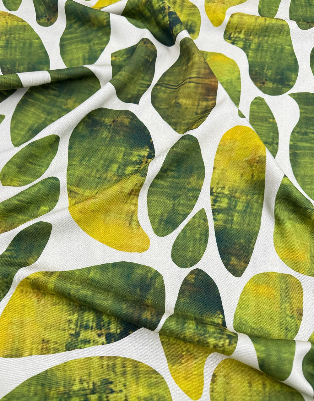 This fabric has an organic, natural feel, with irregular, pebble-like shapes in lush green and yellow tones against a light background. The painterly texture within the shapes gives it a fluid, almost watercolour-like effect, which pairs beautifully with the drapey quality of viscose.
