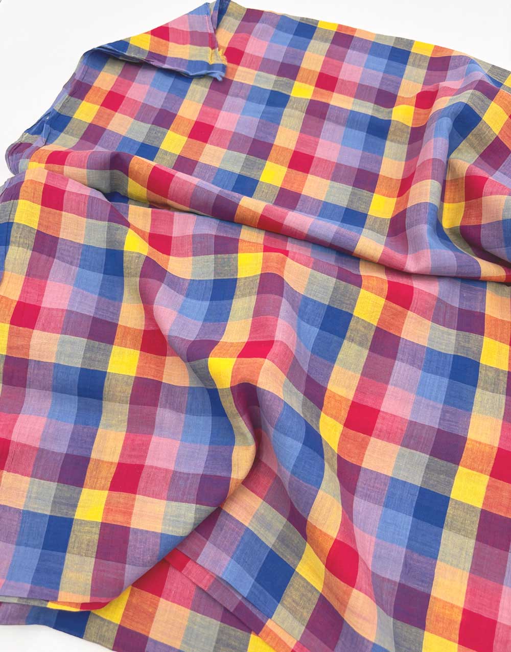 A vibrant celebration of colour, this Picnic Check Indian woven cotton brings instant cheer to your sewing table. Featuring a joyful palette of red, cobalt blue, yellow, lilac and soft peach, the oversized check pattern is perfect for playful summer garments.