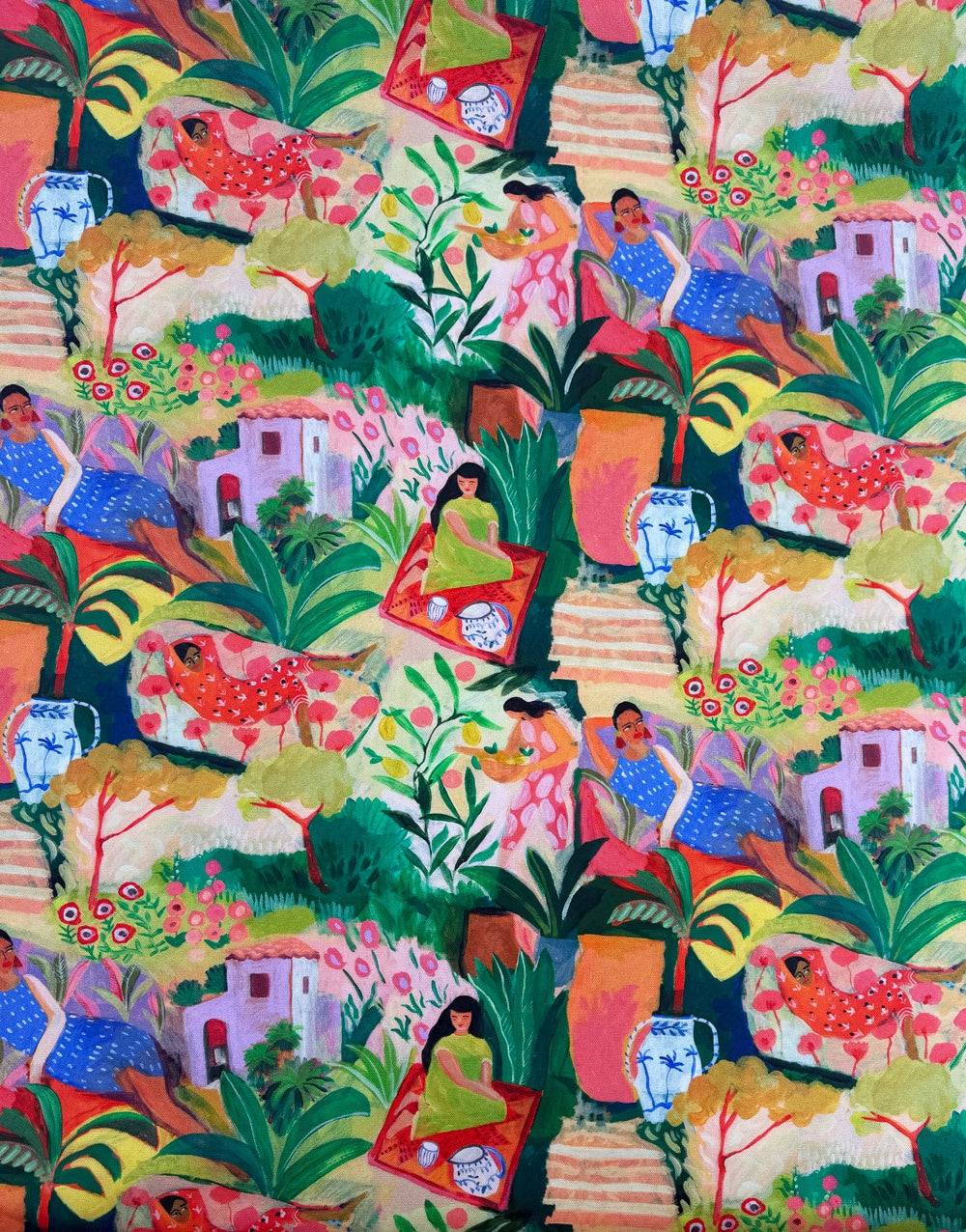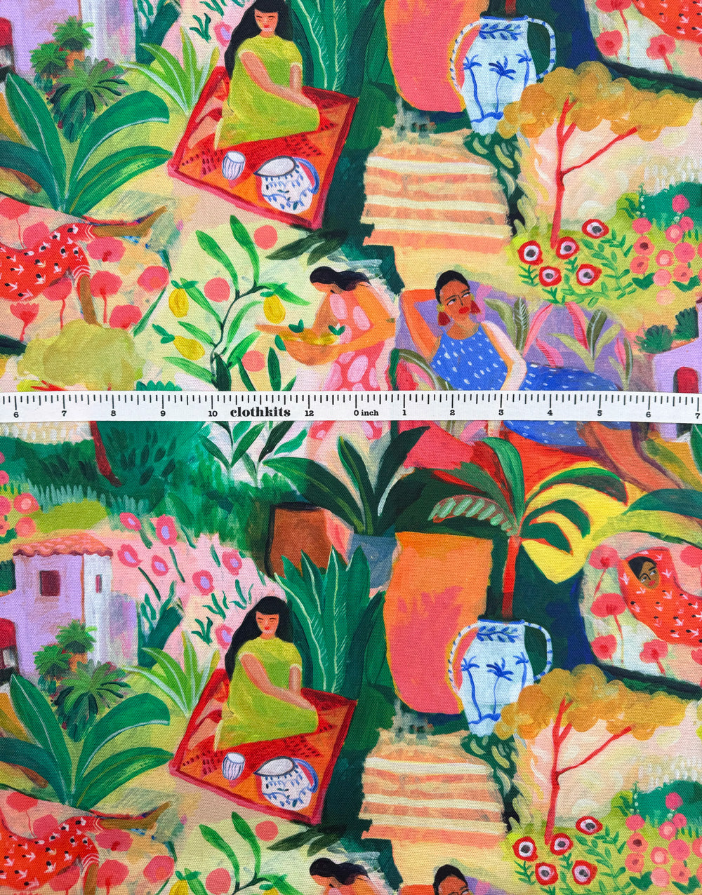 Immerse yourself in a lush paradise with this vibrant large scale Tropical Garden fabric, featuring an artistic print of serene figures, rich greenery, and Mediterranean-inspired details. Perfect for statement garments, home decor, and accessories.
