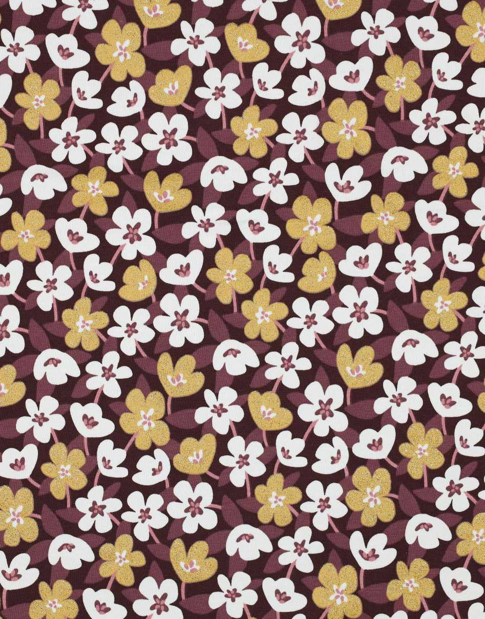 A fun flower print with gold glitter. An excellent quality cotton jersey ideal for making t-shirts, dresses and much more.