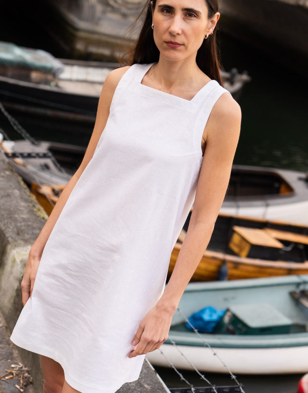 The Capri Dress is a loose-fitting, A-line style featuring a clean square neckline and subtle bust darts for gentle shaping. Designed with hidden pockets in the side seams, the dress fastens at the back with a single button, secured on an underlap finished with neat facings. While unlined, the neckline and armholes are structured with internal facings for a polished finish.