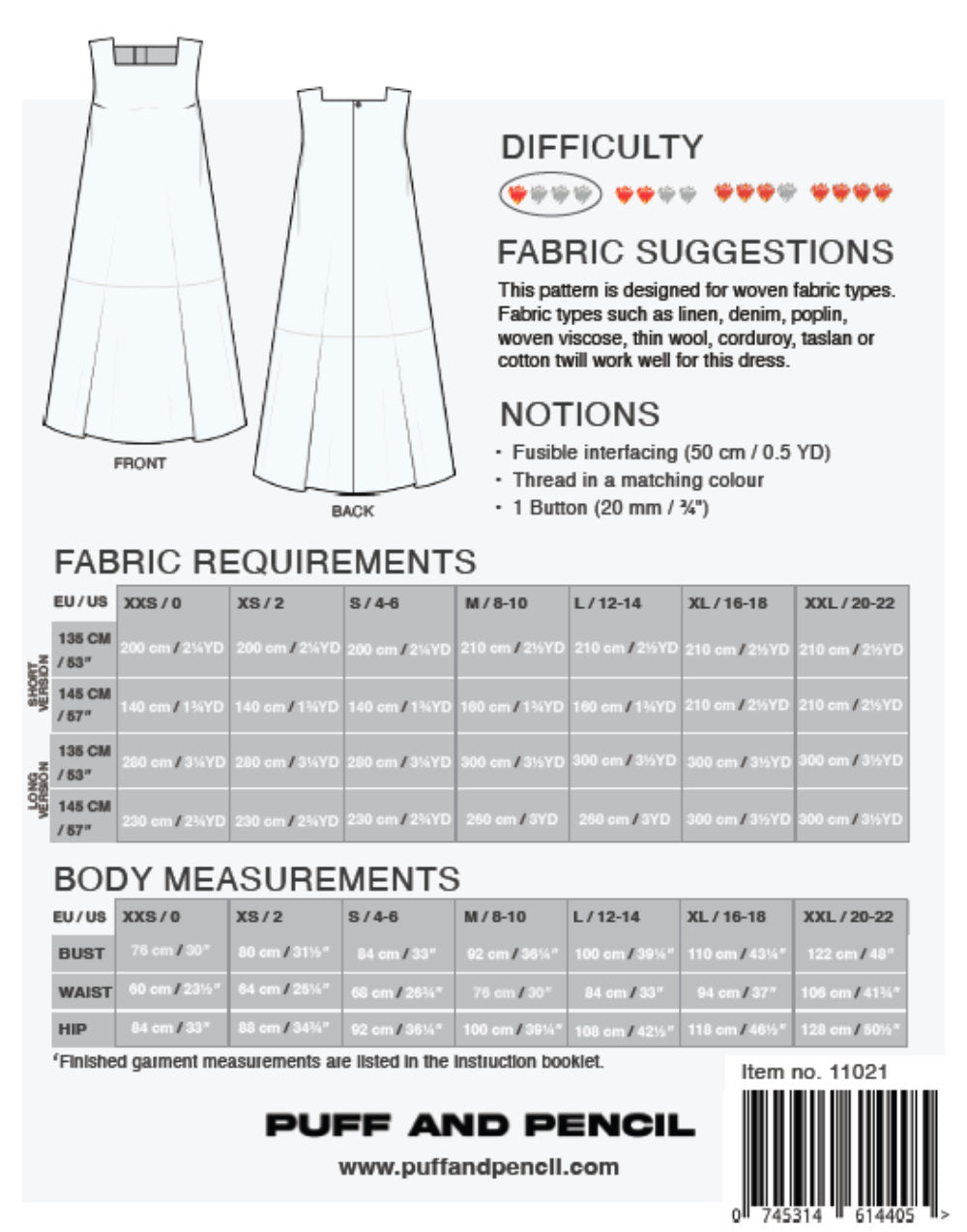 Fabric Suggestions: This pattern is designed for woven fabrics. Fabrics such as taslan, denim, linen, poplin, woven viscose, thin wool, corduroy, and cotton twill work well.