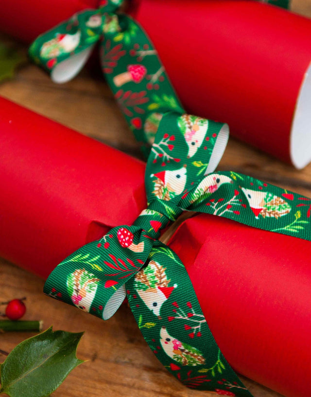 Cute and Christmassy! This delightful ribbon features Mr and Mrs Hedgehog surrounded by toadstools and forest foliage, bringing a woodland charm to your festive makes. A sweet and cheerful design that’s sure to become a seasonal favourite.