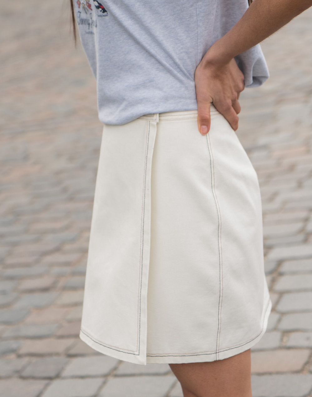 The Clueless Skirt is a quick and easy make that requires minimal fabric. This wrap-around design fastens with two hidden snap buttons, which can be adjusted to comfortably fit the waist.