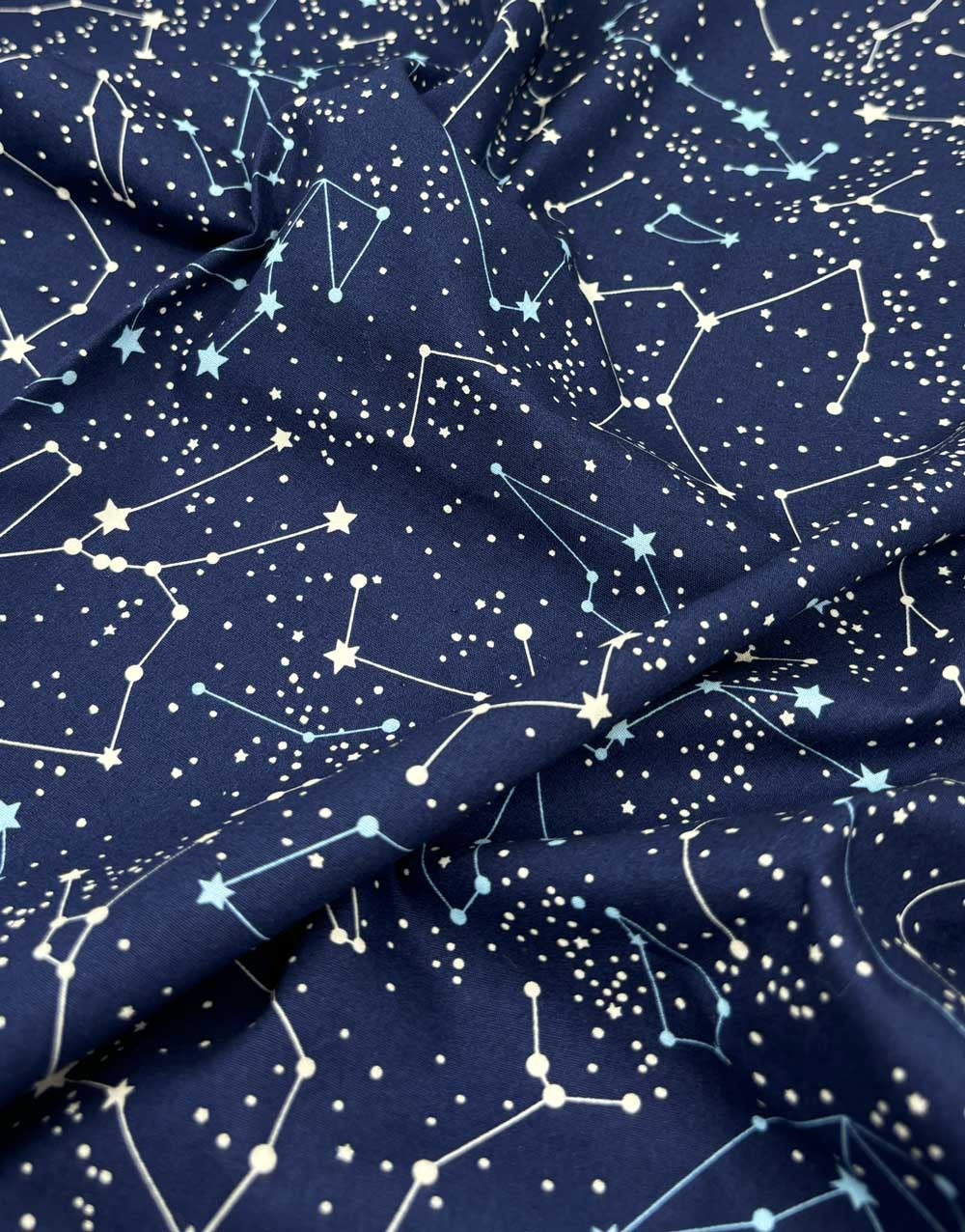 Constellations on a navy cotton poplin. This is a quality cotton poplin fabric, perfect for dressmaking, quilting and crafting.