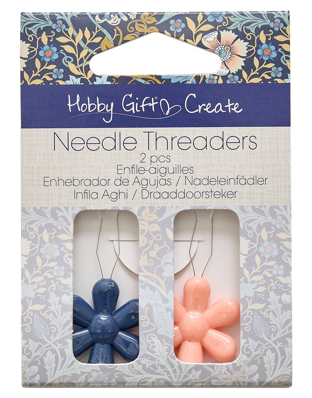 Two flower-shaped needle threaders in coordinating rich blue and pink tones. Designed to make threading both hand and machine needles quick and simple, with an easy-to-hold flower shape.