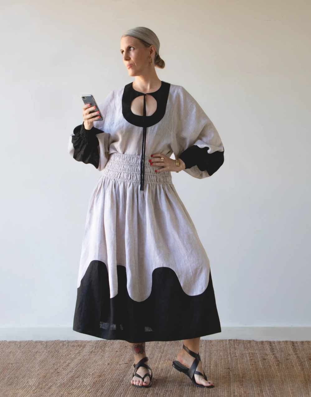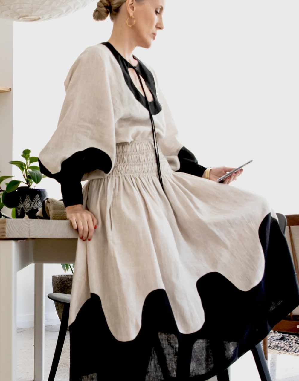 Options for the Harmonic Set include using one colour and excluding wave design, or two fabrics in contrasting colours. Suggested fabrics are lighter textiles that gather well and have enough stability to form the wave shapes. Linen, cotton and stable varieties of cellulose fabrics. Fabric weight under 150 GSM is recommended to minimise the density of the gathers. If using two colours, ensure fabrics are a similar weight. Non-standard grainlines are utilised to reduce fabric requirements therefore directional prints are not advised. Super drapey fabrics for the experienced seamer.