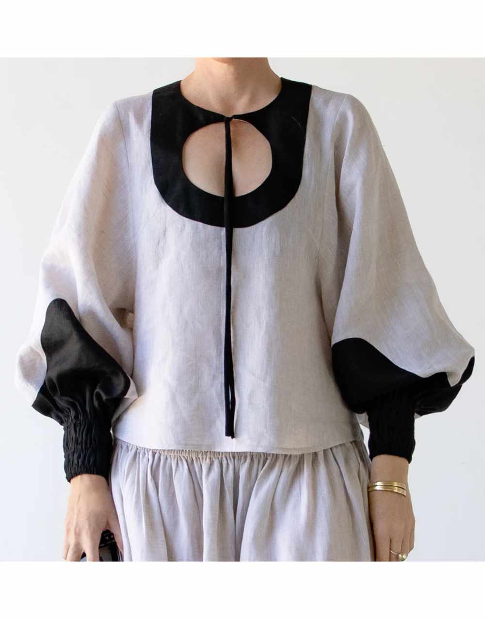 The Harmonic Top has thirteen sizes covering the size range. It has a loose fit with a semi-shaped shoulder for a touch of squareness above the flowing balloon sleeve. The armhole is super deep and cuts into the bodice with a cape-like effect. There are darts in the back neck (covered by a curved yoke) and bust for an elevated fit. The body fit is loose with slight flaring and a curved centre-back seam. The hem is curved high/low shirt tail style, perfect for tucking.