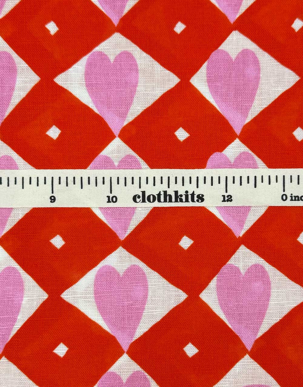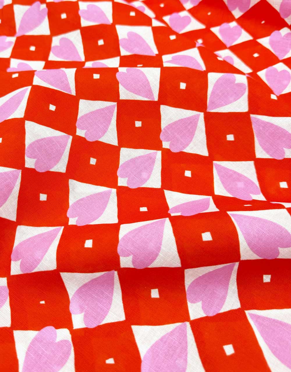 Full of playful charm, this cotton-linen fabric from Australian indie favourites Doops Designs is a lively clash of colour and motif. Rows of bold red diamonds create a punchy geometric grid, each one scattered with soft pink hearts that bring a sweet and cheeky twist. The repeat is graphic yet whimsical, making it a standout design with bags of personality.