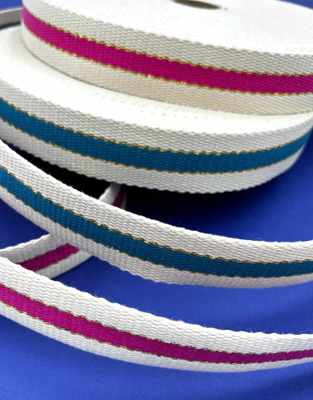 Excellent quality robust cotton webbing with a metallic stripe running through it. Ideal for bag making and belts.