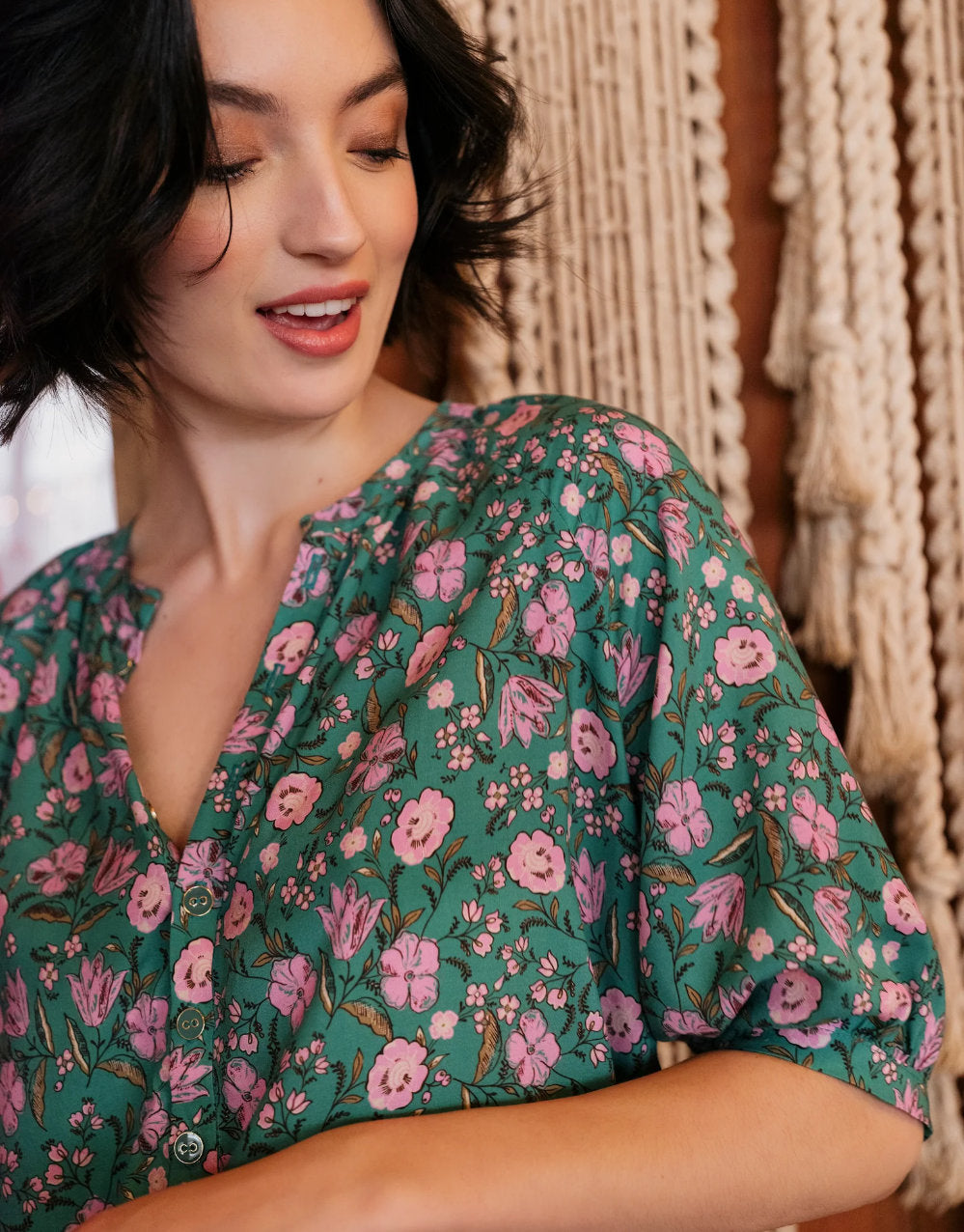 Olivia is a charming blouse with raglan sleeves and an elegant popover placket – perfect for a relaxed yet refined look. She features mid-length sleeves, gentle gathers at the collar, and a softly rounded hem for a flattering finish.