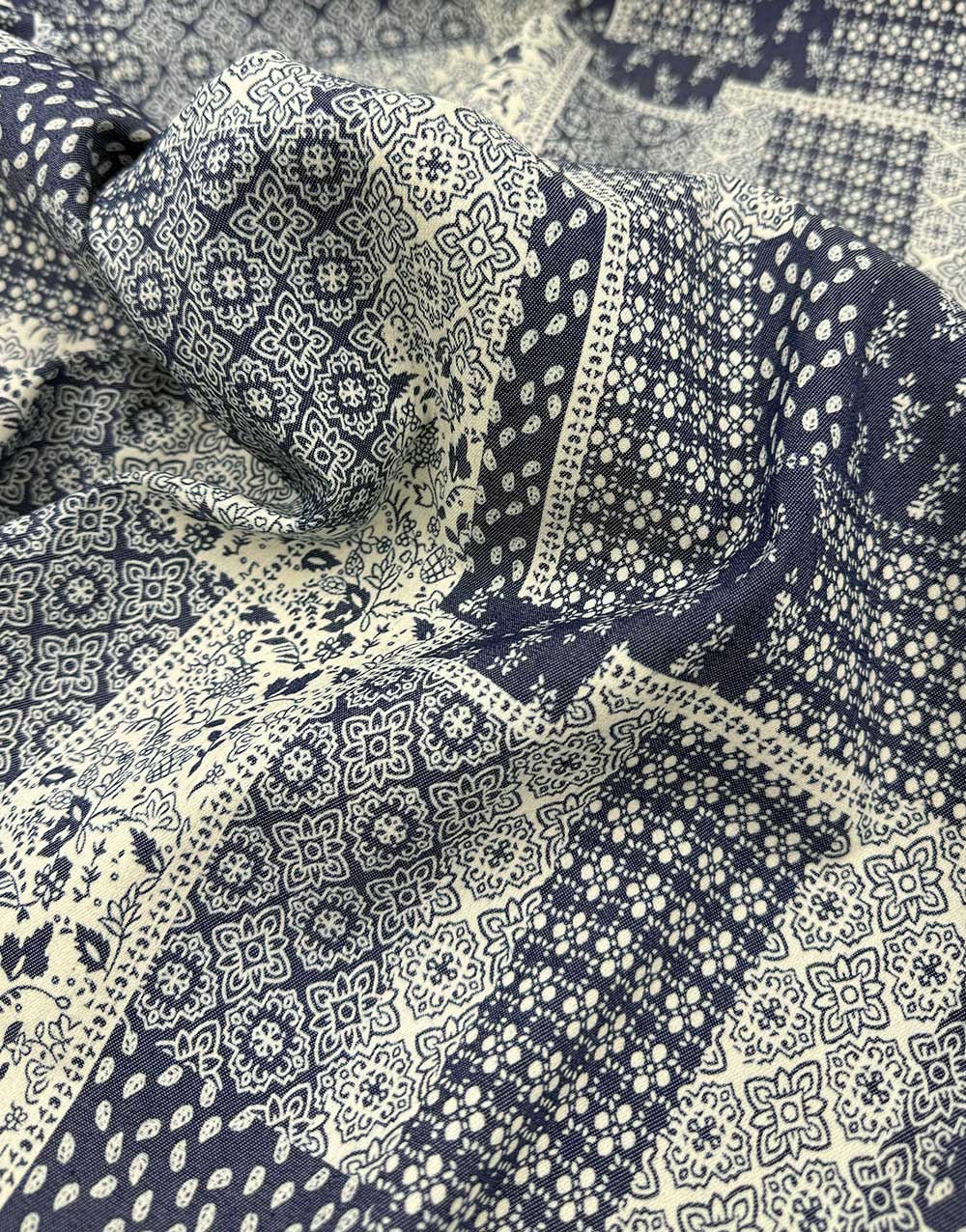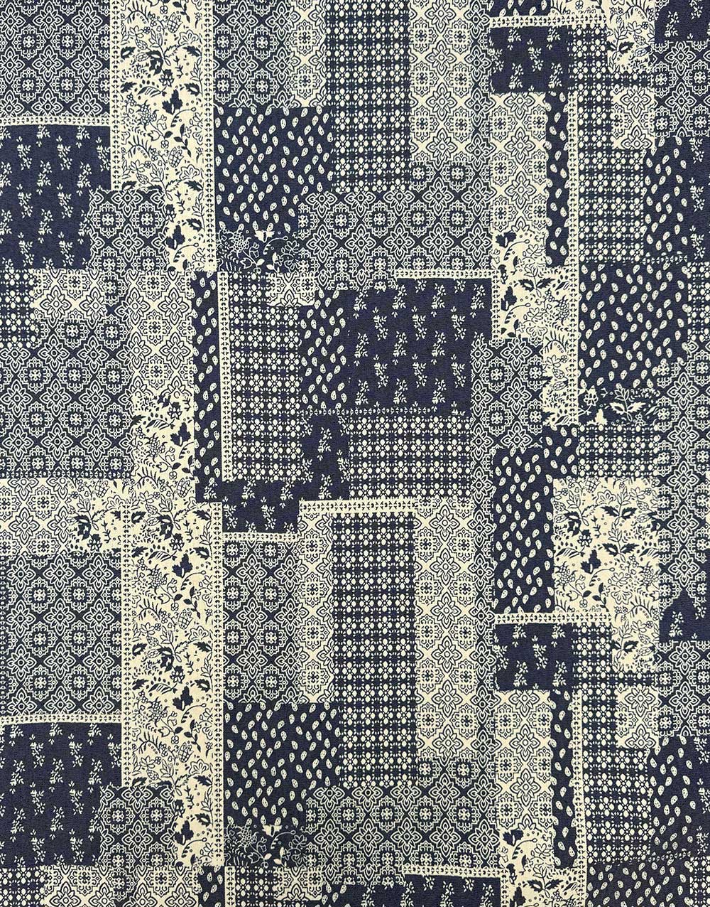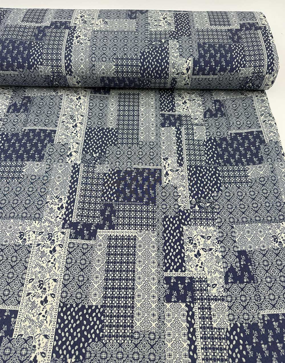 A beautiful Indigo Chambray Patchwork Cotton, this fabric combines the timeless appeal of chambray with the artistry of a printed patchwork design. The soft indigo base is scattered with intricate patchwork-style motifs, giving the look of pieced fabric without the sewing, perfect for those who love a handcrafted aesthetic with an easy finish.