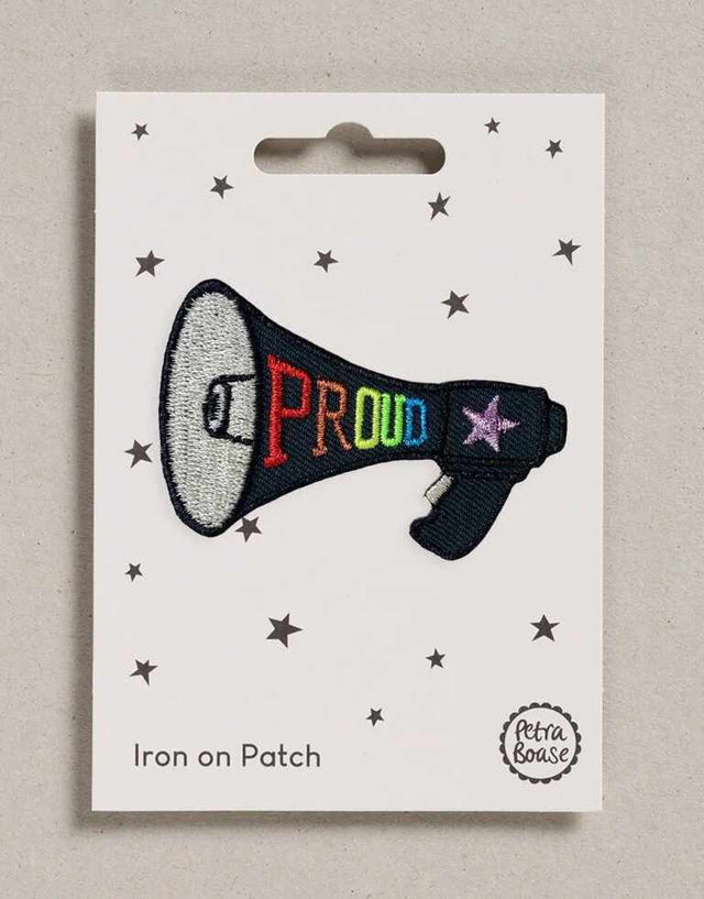 A Megaphone iron on patch with embroidered PROUD wording. Embellish clothes and bags with these happy iron on patches designed by Petra Boase. A little gift for those that love a bit of fashion accessorising and great for stockings and party bags.