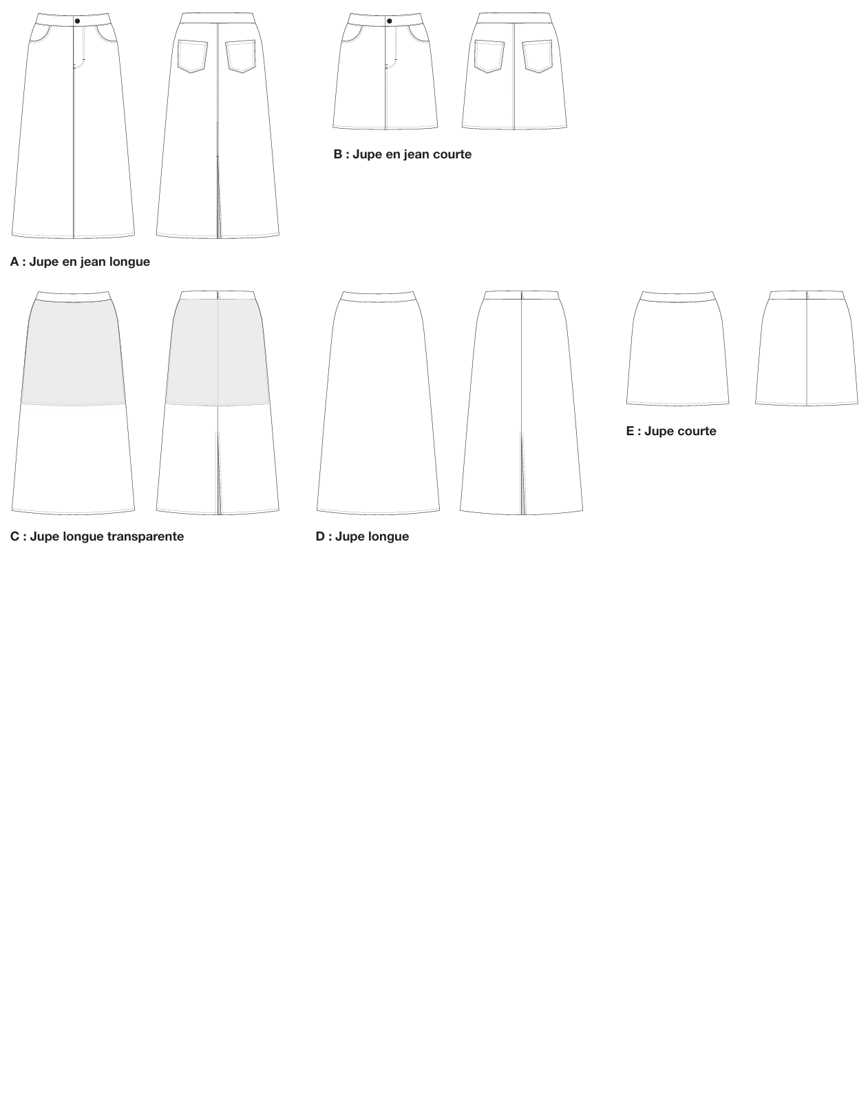 The third version is a simple, elegant skirt with a slightly flared silhouette, a lower fitted waistband, and an invisible back closure. Like the denim version, it features a back vent and can be made in either a long or short length.