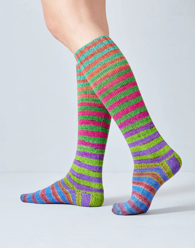 Bright, uplifting and full of playful stripes, this sock yarn is dyed by hand in Turkey and designed to bring a little joy to your knitting. The colours shift beautifully as you stitch, making it just as satisfying to knit as it is to wear.
